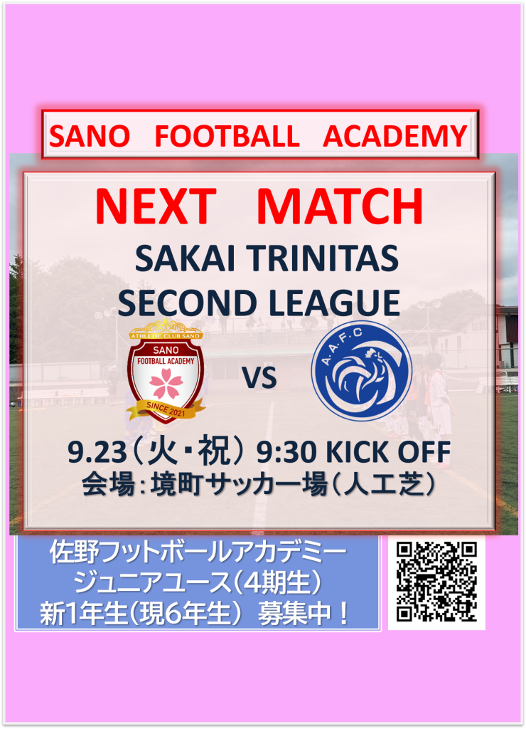 【2025 SAKAI TRINITAS SECOND LEAGUE 試合予告】 投稿日: 2025年9月18日2025年9月18日 投稿者: nemoto 【2025 SAKAI TRINITAS SECOND LEAGUE 試合予告】 vs ACアスミ(埼玉) 2025.9.23(火・祝) 9:30 KICK OFF 会場:境町サッカー場(人工芝) # 2025 SAKAI TRINITAS SECOND LEAGUE # 佐野フットボールアカデミーU14.13 # 境町サッカー場(人工芝)