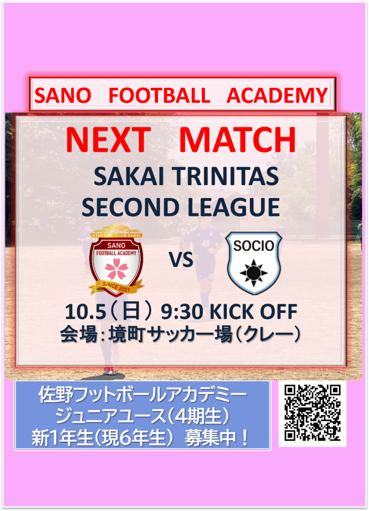 【2025 SAKAI TRINITAS SECOND LEAGUE 試合予告】 投稿日: 2025年9月30日2025年9月30日 投稿者: nemoto 【2025 SAKAI TRINITAS SECOND LEAGUE 試合予告】 vs 杉並ソシオFC(東京) 2025.10.5(日) 9:30 KICK OFF 会場:境町サッカー場(クレー) # 2025 SAKAI TRINITAS SECOND LEAGUE# 佐野フットボールアカデミーU14.13# 境町サッカー場(クレー)