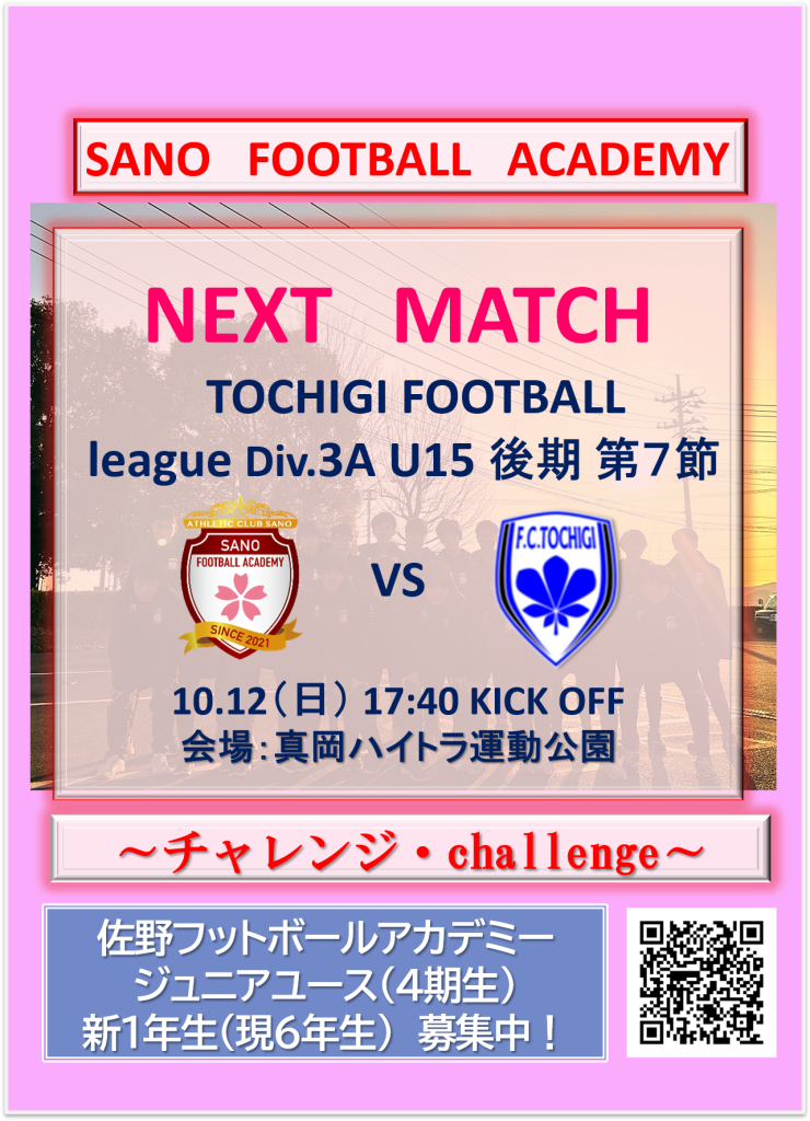 【TCY LEAGUE U15 3A後期 第7節 試合予告】 投稿日: 2025年10月10日2025年10月10日 投稿者: nemoto 【TCY LEAGUE U15 3A後期 第7節 試合予告】 栃木県ユースサッカーリーグU15 3A後期 第7節 vs F.C.TOCHIGI U14 2025.10.12(日) 17:40 KICK OFF 会場:真岡ハイトラ運動公園(人工芝グラウンド) 子供達に熱い応援、よろしくお願いします📣 #佐野フットボールアカデミーU15 #栃木県ユースサッカーリーグU15 3A #真岡ハイトラ運動公園