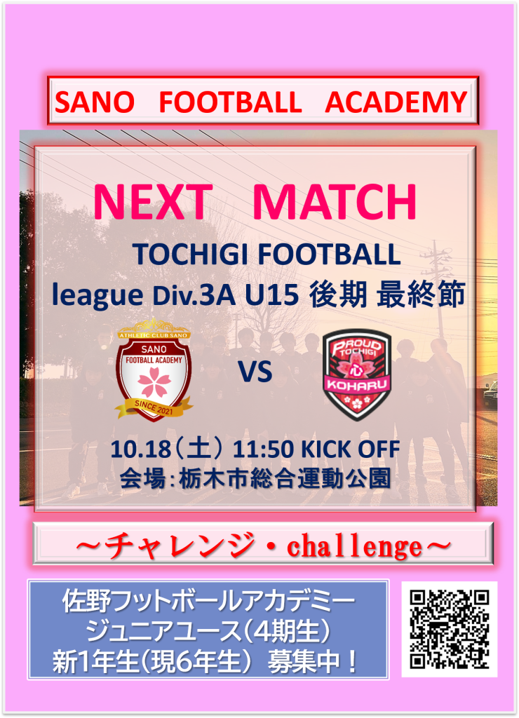 【TCY LEAGUE U15 3A後期 最終節 試合予告】 投稿日: 2025年10月14日2025年10月14日 投稿者: nemoto 【TCY LEAGUE U15 3A後期 最終節 試合予告】 栃木県ユースサッカーリーグU15 3A後期 最終節 vs KOHARU PROUD 栃木FC 2025.10.18(土) 11:50 KICK OFF 会場:栃木市総合運動公園 子供達に熱い応援、よろしくお願いします📣 #佐野フットボールアカデミーU15#栃木県ユースサッカーリーグU15 3A#栃木市総合運動公園