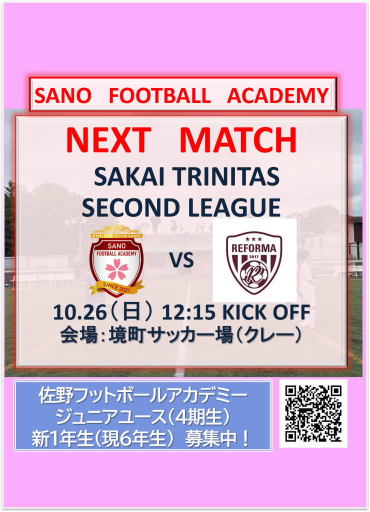 【2025 SAKAI TRINITAS SECOND LEAGUE 試合予告】 投稿日: 2025年10月23日2025年10月23日 投稿者: nemoto 【2025 SAKAI TRINITAS SECOND LEAGUE 試合予告】 vs REFORMA(千葉) 2025.10.26(日) 12:15 KICK OFF 会場:境町サッカー場(クレー) # 2025 SAKAI TRINITAS SECOND LEAGUE # 佐野フットボールアカデミーU14.13 # 境町サッカー場(クレー)