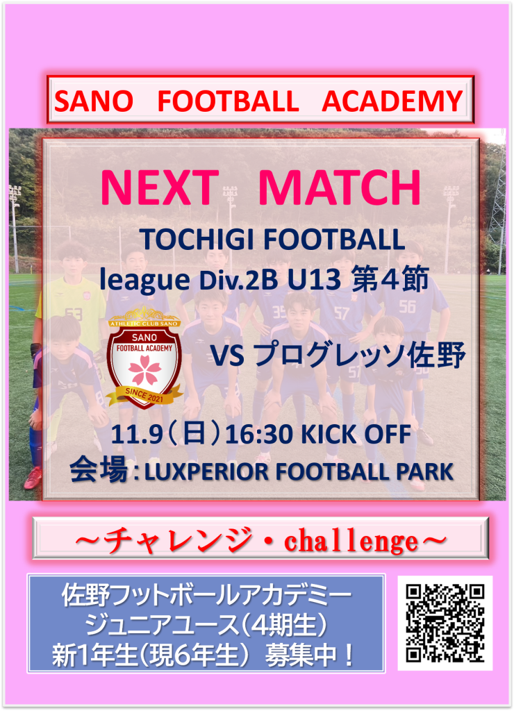 【TCY LEAGUE U13 2B 第4節 試合予告】 投稿日: 2025年11月5日2025年11月5日 投稿者: nemoto 【TCY LEAGUE U13 2B 第4節 試合予告】 栃木県ユースサッカーリーグU13 2B 第4節 vs プログレッソ佐野FC 2025.11.9(日) 16:30 KICK OFF 会場:LUXPERIOR FOOTBALL PARK 子供達に熱い応援、よろしくお願いします📣 #佐野フットボールアカデミーU13 #栃木県ユースサッカーリーグU13 2B #LUXPERIOR FOOTBALL PARK
