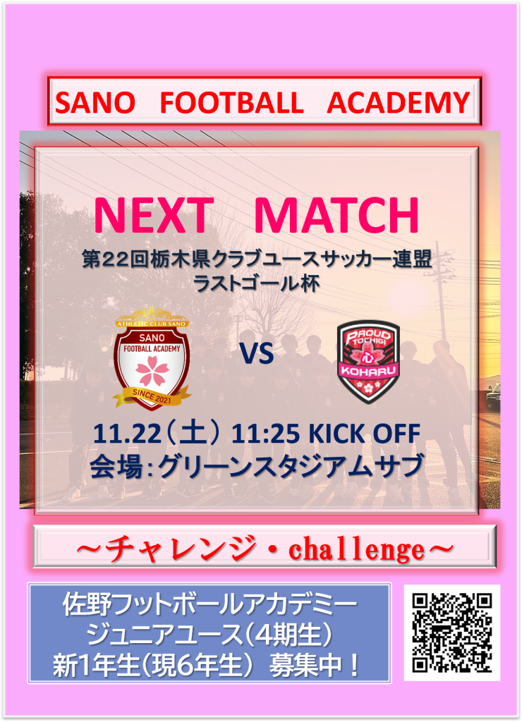 【第22回栃木県クラブユースサッカー連盟ラストゴール杯 試合予告】 投稿日: 2025年11月17日2025年11月17日 投稿者: nemoto 【第22回栃木県クラブユースサッカー連盟ラストゴール杯 試合予告】 第22回栃木県クラブユースサッカー連盟ラストゴール杯 2日目 vs KOHARU PROUD 栃木FC 2025.11.22(土) 11:25 KICK OFF 会場:グリーンスタジアムサブグラウンド 3年生にとって、当アカデミーでの最後の公式戦となります⚽⚽⚽ 選手達に熱い応援、よろしくお願いします📣 #佐野フットボールアカデミーU15 #栃木県クラブユースサッカー連盟ラストゴール杯 #グリーンスタジアムサブグラウンド