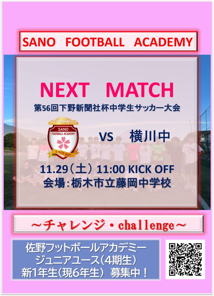 【第56回下野新聞社杯中学生サッカー大会 試合予告】 投稿日: 2025年11月25日2025年11月25日 投稿者: nemoto 【第56回下野新聞社杯中学生サッカー大会 試合予告】 1回戦 vs 横川中 2025.11.29(土) 11:00 KICK OFF 会場:栃木市立藤岡中 # 第56回下野新聞社杯中学生サッカー大会# 佐野フットボールアカデミーU14# 栃木市立藤岡中